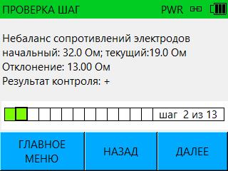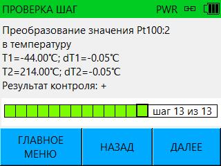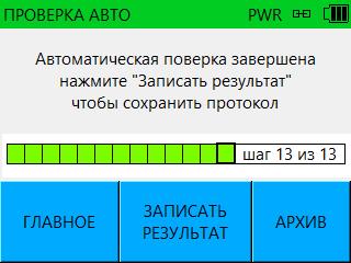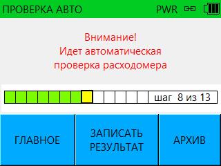 Проверка расходомера может выполняться последовательно по шагам при выборе команды «ПРОВЕРКА ШАГ» (оператор контролирует результаты и подтверждает переход к каждому следующему шагу кнопкой «ДАЛЕЕ» – рисунок 4) или в автоматическом режиме, после выбора команды «ПРОВЕРКА АВТО» (рисунок 5).